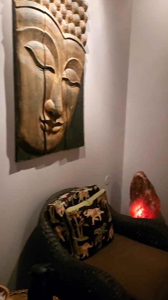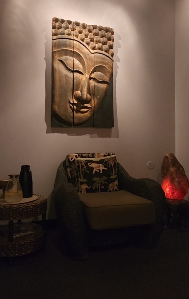The changing area was cozy, with plenty of lockers, a separate powder room, and a dedicated shower room. Each locker contained a plush black robe, and after changing and storing my personal belongings, I made my way back to the Zen Den to fully settle into the experience. I helped myself to a refreshing cup of lemon-infused water (though hot tea was also available) and admired the hand-carved art that adorned the softly lit lounge. Before long, my therapist arrived, greeted me warmly by name, and guided me to our treatment room.