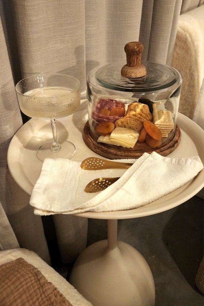 I opted for a glass of prosecco alongside a personal charcuterie board (purchased as an add-on during booking), which turned out to be an incredibly grounding pre-treatment ritual. The board contained a flavorful assortment of cheeses, crackers, dried apricots, gherkins, and a pretty salami rose. A wonderful start to my service.
