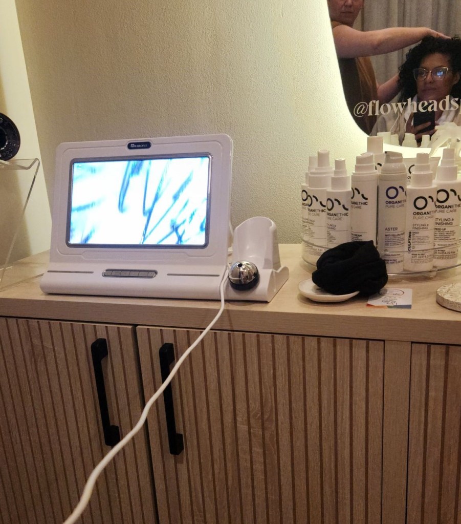 Promptly at my appointment start time, I was warmly greeted by my therapist and escorted to our designated treatment room. Although the rooms are separated by curtains rather than doors, ours felt quiet and private, tucked away in the far back corner of the spa. The service began with a scalp assessment, where I could see my follicles magnified on a screen in front of me. It was fascinating to see my scalp up close, and I was thankful I double-cleansed my hair the day before with a clarifying shampoo!