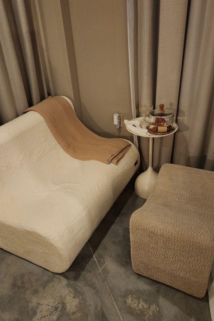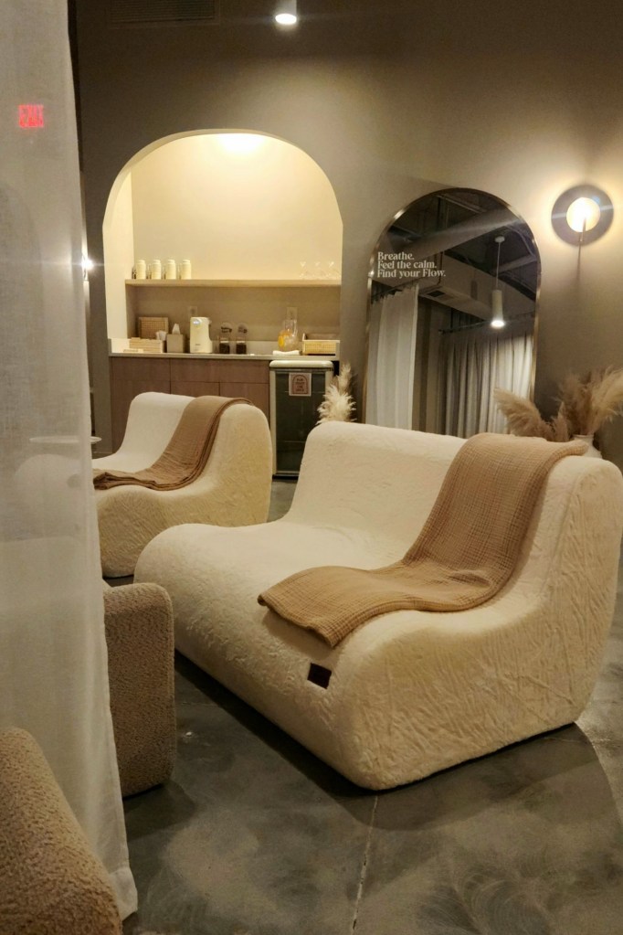 The space itself feels earthy and spa-industrial, yet still very warm and intimate. Ambient music played softly, layered with the gentle sound of a bubbling stream that invited calm, as well as served to dampen additional noise. The comfortable loungers in the waiting area were partitioned with gossamer curtains that offered enough privacy to feel cozy, but not isolating. The array of textures in the space nicely balanced each other out with the fluid lines of the seating, velvety drapery in place of doors, and curved archways, softening the more industrial elements such as the concrete floors and exposed ductwork above.